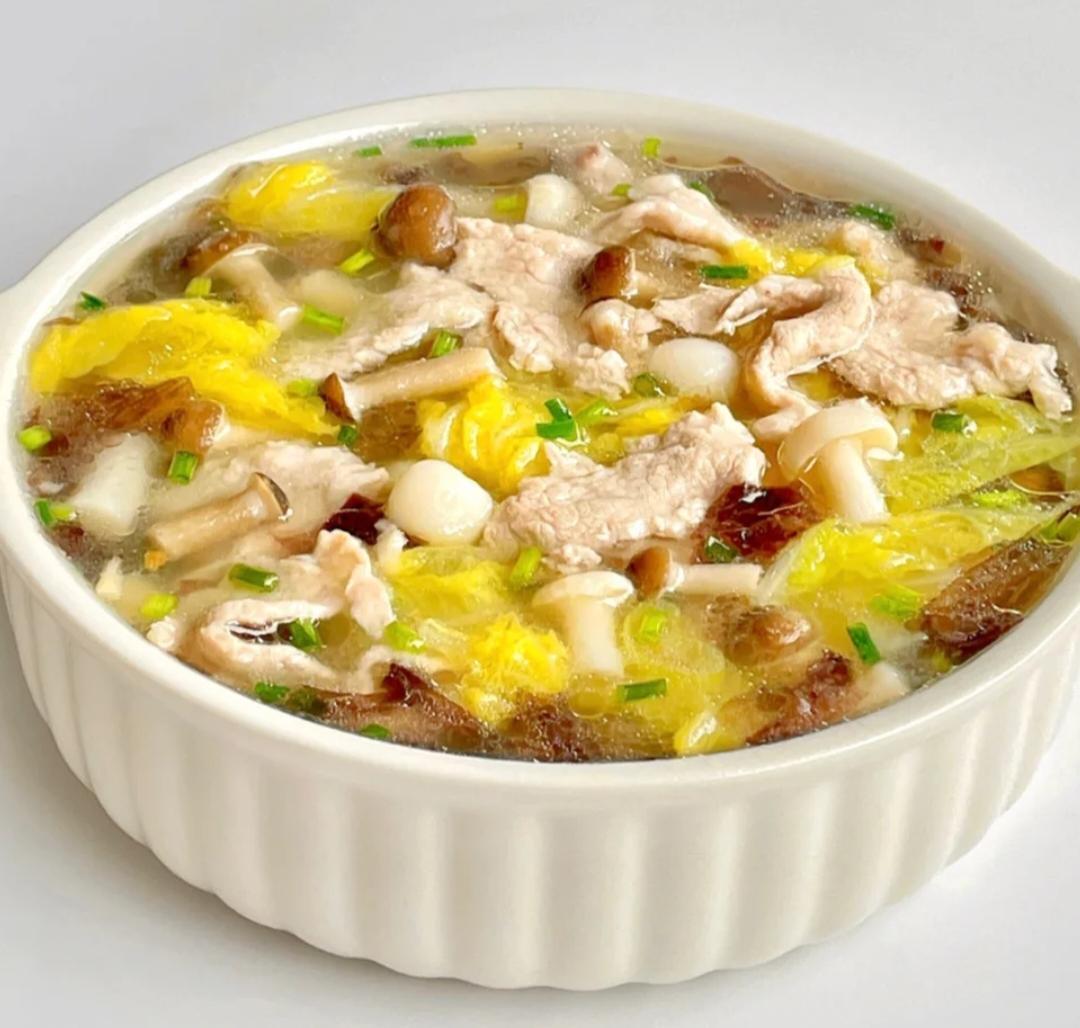 食材:猪里脊肉,白玉菇,娃娃菜,紫菜,虾皮