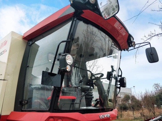 5.我们看一下驾驶室内部,它的操纵系统是一杆操纵的,将割台升降、拨禾轮升降、行走无级变速功能集中到一个操纵手柄上,同时将卸粮筒的开合、主离合改为按钮式的。全部是手指一点,轻松完成,有效减少了驾驶员的操作强度。太空舱座椅、方向盘前后可调,驾乘舒适;还配置8寸的智能真彩触屏显示器,可实时监控发动机工况参数,作业工作报警,工作装置(轴流滚筒、升运器、切碎器、风机等)状态监控,倒车影像、割台高度限位调整,粮满自动报警也可实时监控,同时还可以实现MP3播放等功能;另可选装空调。