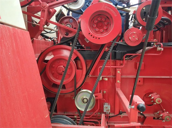 10.动力输出以及行走皮带升级为齿形带,右侧中间轴到第一滚筒的皮带改为齿形带,提高散热性和可靠性,稳定滚筒转速。整机采用集中润滑系统,操作简单、便捷。安全离合器弹簧加大,增加传递扭矩,不打滑,性能更稳定。