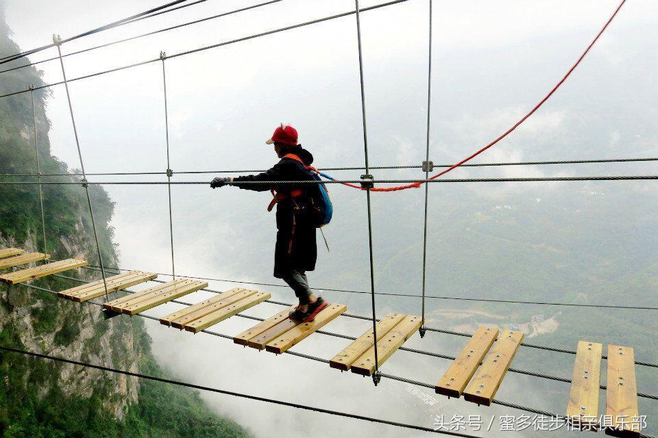 走过玻璃栈道的徒友总是感觉没有想像中的惊险刺激,不过瘾!对很多喜欢户外的徒友来说,不到九皇山去走走云中情人桥,那肯定是一大遗憾哈!不过要注意了,我们说的云中情人桥,是指平行于情人索桥,横跨于两山之间,落差约300多米的悬空步道,这是九皇山风景区刚刚开通的一个户外体验项目,据说这座天桥才真正把很多人的腿吓软了!估计敢上去走走的都绝对是胆大的,吃瓜的群众去围观一下呐喊助威就好哈!