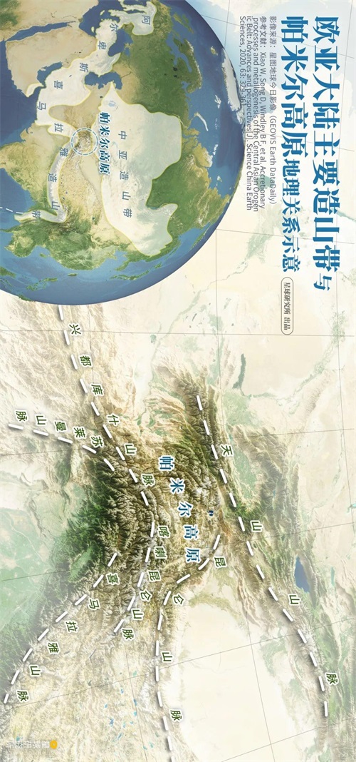 (请横屏观看,欧亚大陆主要造山带与帕米尔高原位置关系示意,制图@张松楠&张琪/星球研究所)