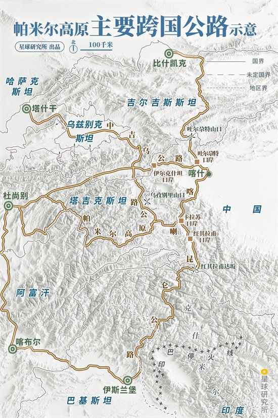 (帕米尔高原主要跨国公路示意,制图@张松楠&张琪/星球研究所)