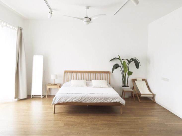 整个卧床区没有衣柜,只有吊扇射灯,超级环保的实木大床,阔叶绿植,躺椅和一个小的床头柜和落地镜。