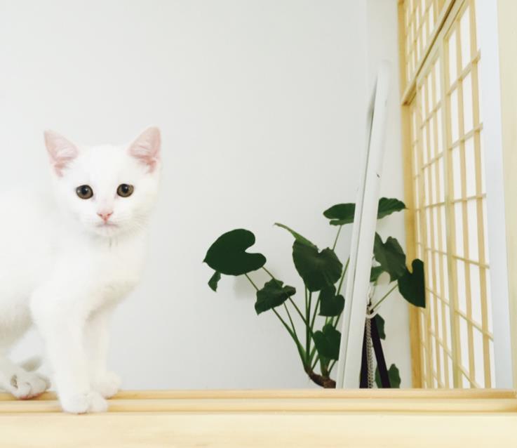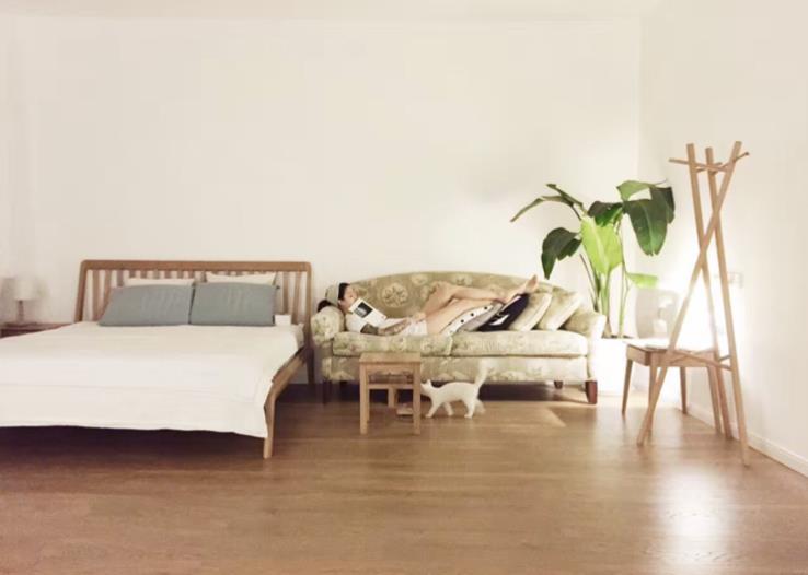 因为家具很少,可以根据喜好自由摆放,偶尔把沙发摆放到床右侧,躺在上面逗逗猫,好惬意。
