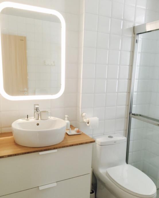 主卫的收纳功能要求更多,要保证水槽上干净无物,就需要把洗漱用的必需品存放在镜柜里。两组镜柜相当实用。