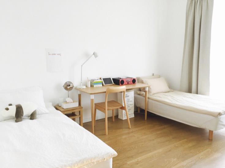 未来的儿童房,很大所以摆放了两个单人床,中间摆放书桌可以作为独立书房,客人来了可以临时居住。