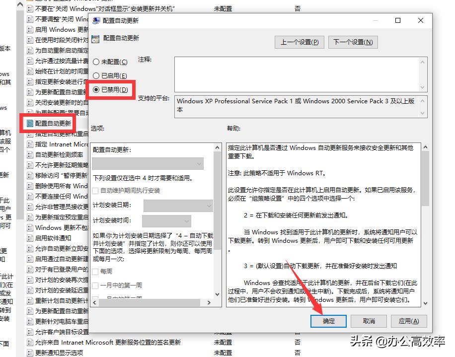 7接下来找到”配置自动更新 “项并双击进入,在其弹出的窗口中勾选”已禁用“项,点击”确定“按钮。