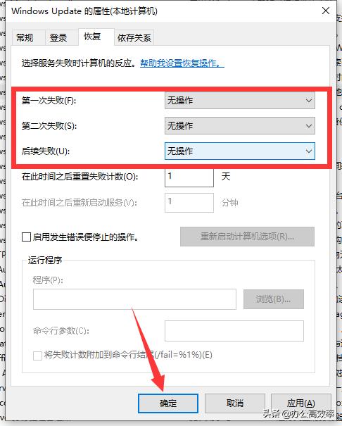 4然后再切换到“恢复”选项卡,将默认的“重新启动服务”改为“无操作”项,最后点击“应用”和“确定”按钮即可。