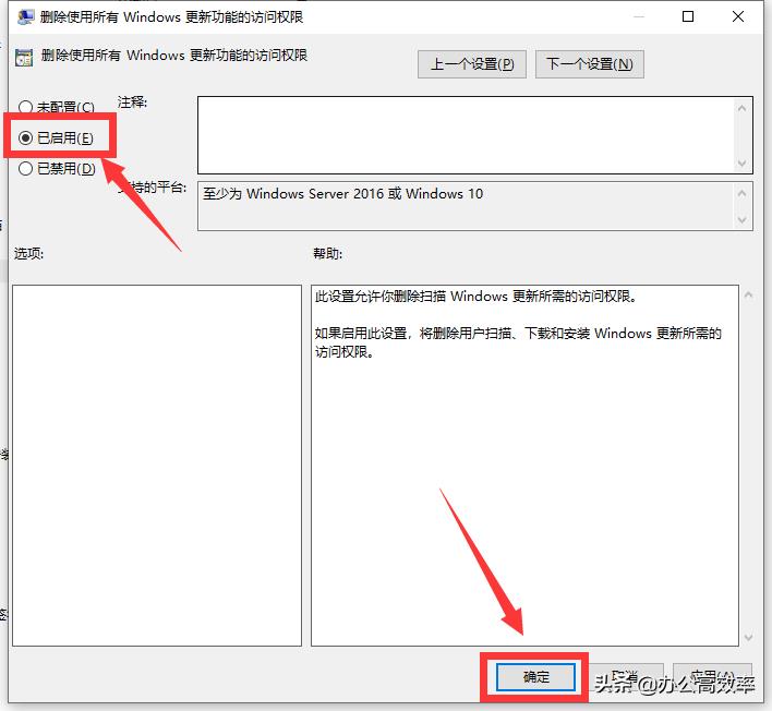 8同时我们还需要在找到“删除使用所有Windows更新功能的访问权限”选项,在”属性“界面中,选择已启用项,最后点击”确定“按钮即可。