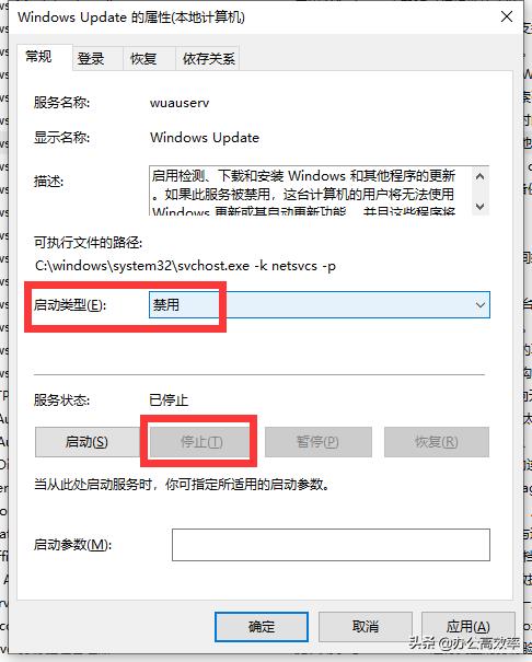 3接下来在其“属性”界面中,点击“停止”按钮后,再将“启动类型‘设置为”禁用“项。