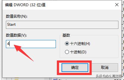 13双击”Start“键值打开,将其中的数值设置为”4“,点击”确定“按钮。
