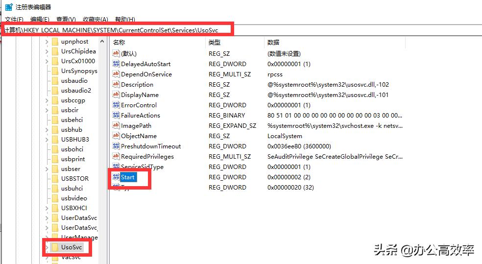 12从打开的注册表界面中,依次展开[HKEY_LOCAL_MACHINE\SYSTEM\CurrentControlSet\Services\UsoSvc],并在右侧找到“Start”键。