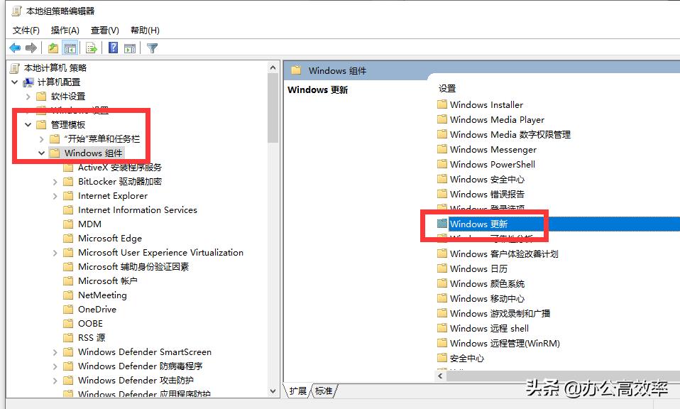 6待打开组策略编辑界面后,按图示进行操作依次展开 计算机配置 -> 管理模板 -> Windows组件 -> Windows更新项进行双击打开。