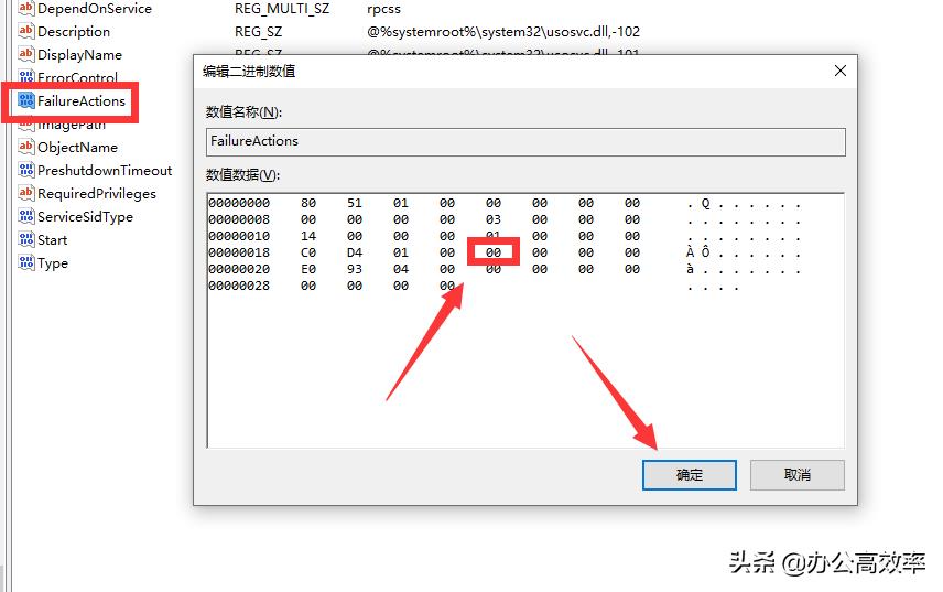 14接着我们在找到“FailureActions”键,双击打开,并将“0010”、“0018”行的左起第5个数值由原来的“01”改为“00”,最后点击“确定”即可。
