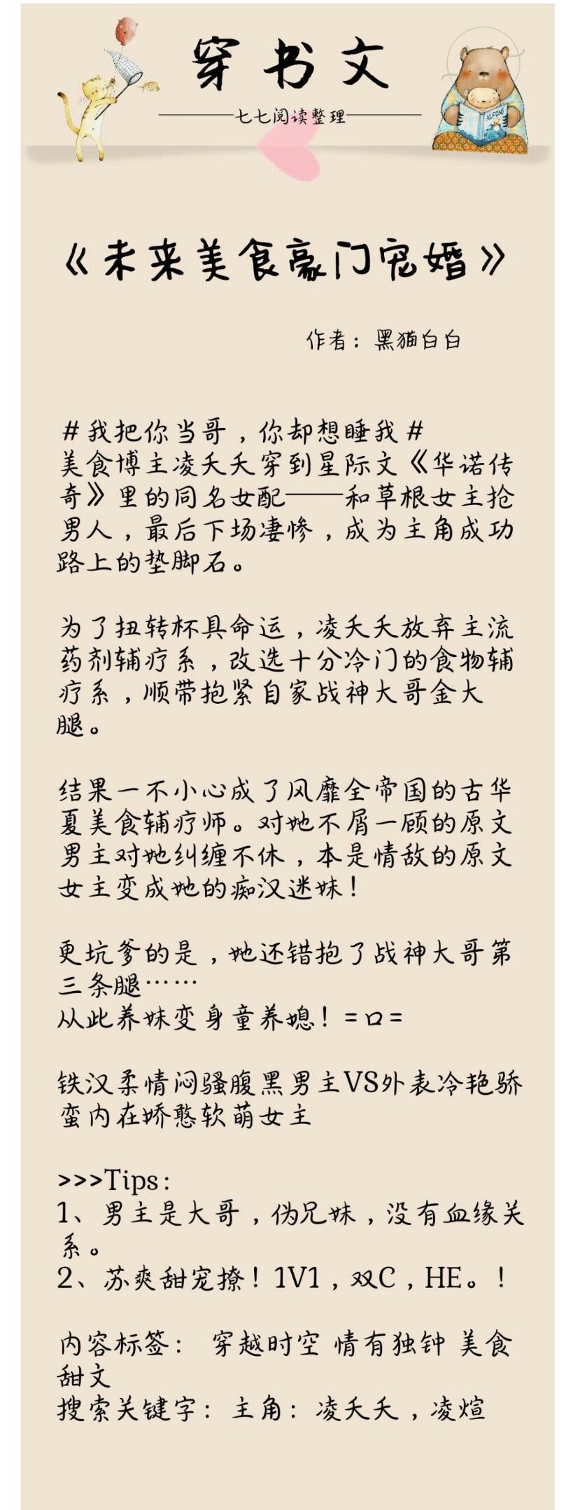 Ps:未来星际,伪兄妹文,女主有超凡的厨艺,靠厨艺征服世界,抱上哥哥的大腿,结果反被哥哥吃掉。女主不仅厨艺好,战斗技能也是杠杠的,在穿书世界里慢慢成长,最后还生了两个小包子。小说内容跟文笔都挺不错的,还有一帮萌萌的配角,超甜