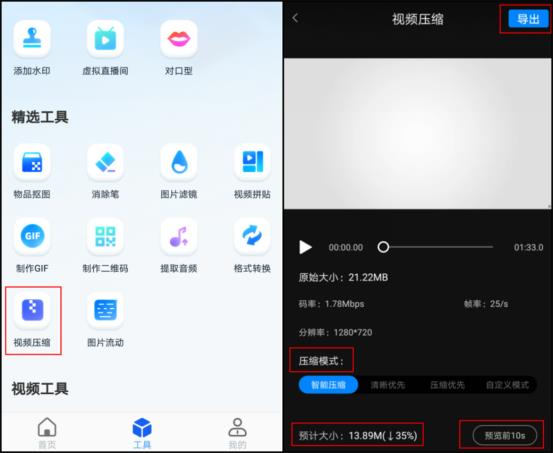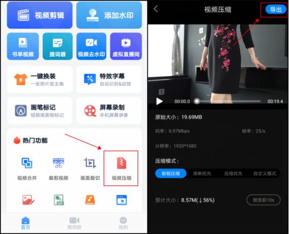 将APP打开,在主页面中找到【视频压缩】功能。点击之后添加进去要压缩的文件,然后确认好压缩模式之后,直接选择【导出】功能选项就可以了。