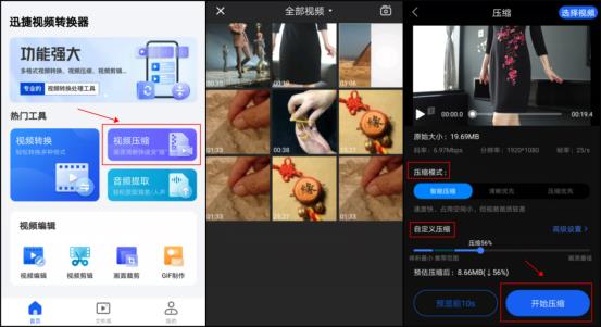 第一个步骤:在APP当中找到【视频压缩】选项,接着添加视频文件进去。文件添加完毕之后,在转换页面可以先设置好【压缩模式】。设置好之后就可以点击【开始压缩】了。