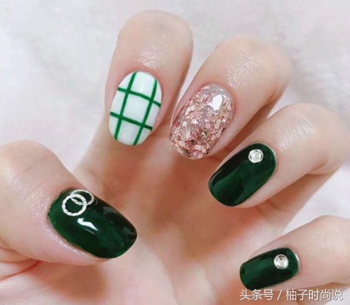 墨绿色的美甲很温柔很显白,并且也很有气质,用绿色条纹来修饰,粉色的亮片也很好看,用水钻和小金属来修饰,超级好看。