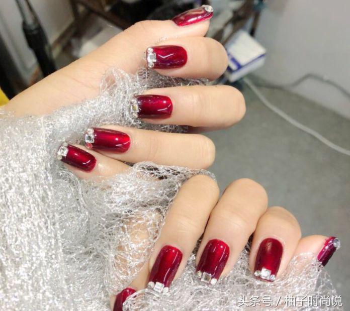 这种酒红色是非常好看的颜色,用水钻来修饰衬托,指尖的一抹晶莹剔透,手指白皙,看起来也非常高贵优雅。