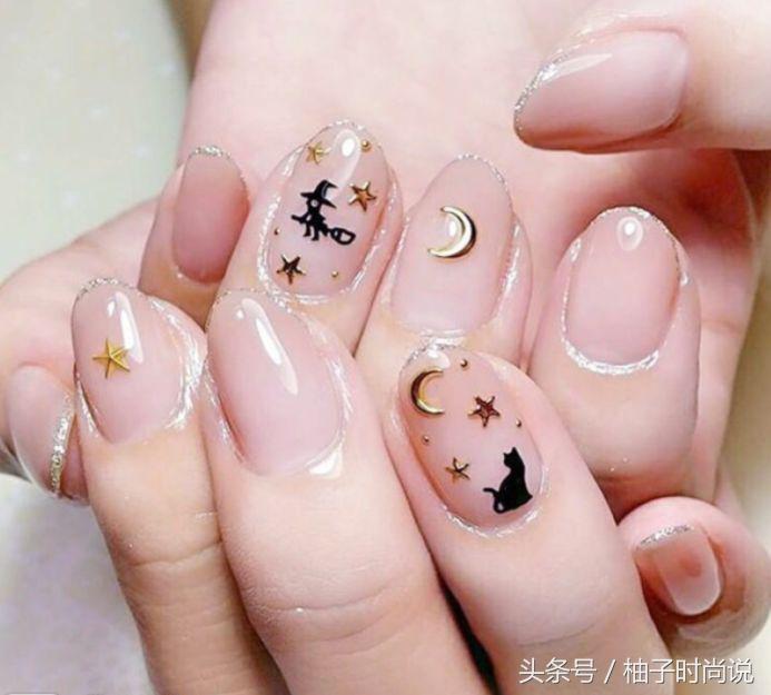 透明色打底会看起来很透明,指尖会变得小精致,用星星和月亮图案来修饰,猫咪的图案看起来很可爱,简单的图案变得精致起来。