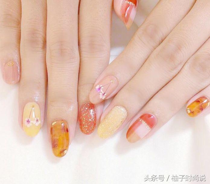 干花图案很仙女的,也是今年非常流行的颜色,黄色看起来很温柔,浅浅的红色看起来也很养眼,整体就是看起来很有格调的美甲。