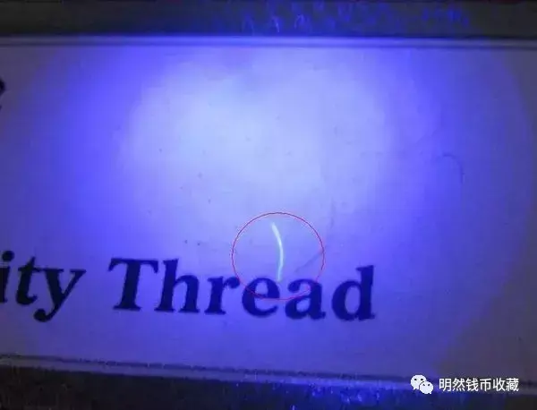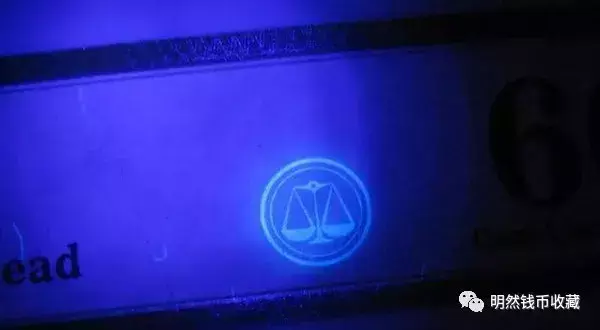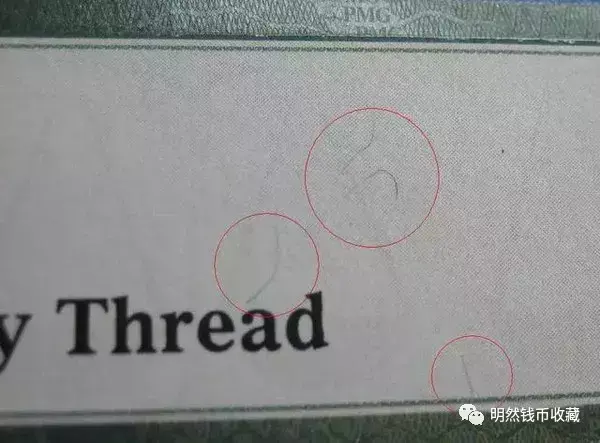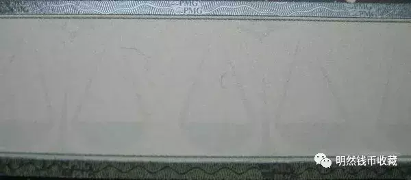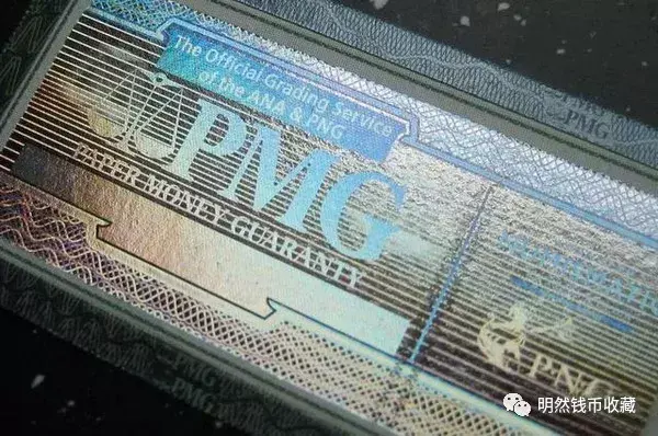 PMG评级纸币标签的正面左侧,用光变油墨印刷“PMG”字样和天平形状的标志,垂直视角下为灰黑色,倾斜视角下为绿色。这种防伪措施大家应该很熟悉了,在目前流通的五版纸币正面左下角就有,是一般大众鉴别大额纸钞时的常借助的手段。