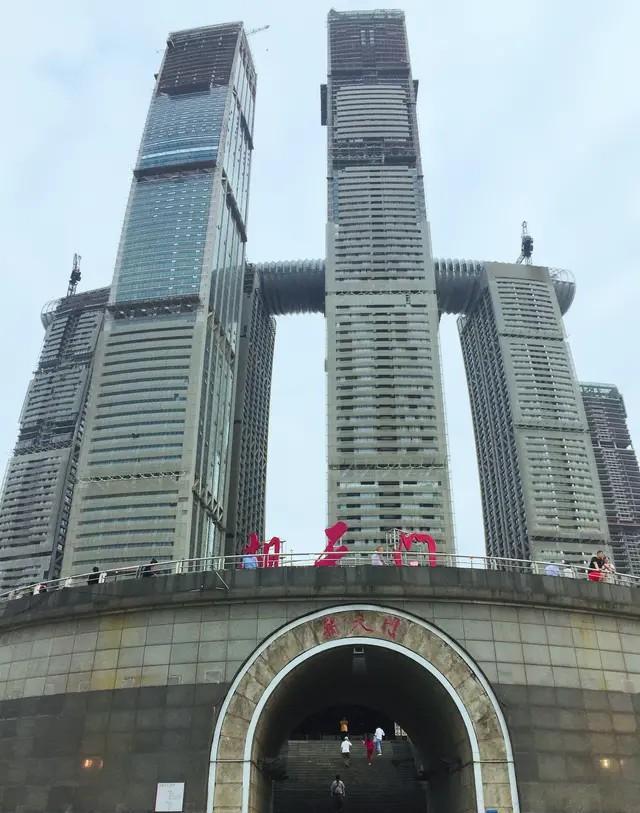 朝天门为重庆沿江九门之一,位于重庆半岛的东南尖端,低水位沙嘴海拔为160米,是市区最低海拔处。长江的九大主要支流之一的嘉陵江在此与长江汇流,一泻数千里注入东海。重庆是素称“黄金水道”的长江的重要港口之一,是长江上游的经济中心城市。在这里,每天运送数千客人游览壮观的长江三峡,吞吐着万吨货物。“楼台市气笙歌外,朝暮江声鼓角中。”这是古诗中的朝天门码头,而我眼前所见的,比诗歌中更加气派一些。