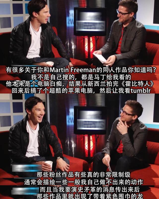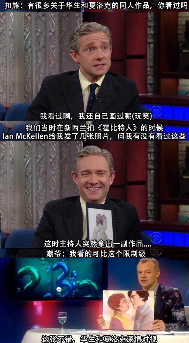 这时,主持人拿出几幅夏洛克和华生的同人画作,马丁接着说:"我看的可比这个限制级多了。"