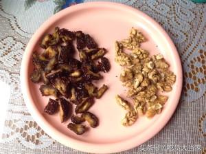 枣肉用剪刀去核一颗枣肉剪成小四块,一颗核桃肉掰成4小块。