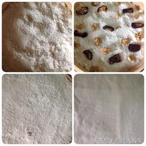 1、用勺子把筛好的粉舀入蒸笼平铺一层,千万不能按压哦。否则不易蒸熟。2、摆上适量的枣肉、核桃肉。同理不要按压。3、重复上一步骤,再铺一层粉一一枣肉、核桃肉,然后再铺一层粉,用勺底轻轻地抹平表面。4、取一块沾水拧干后的纱布或棉布覆盖在上面,以防表面干燥。