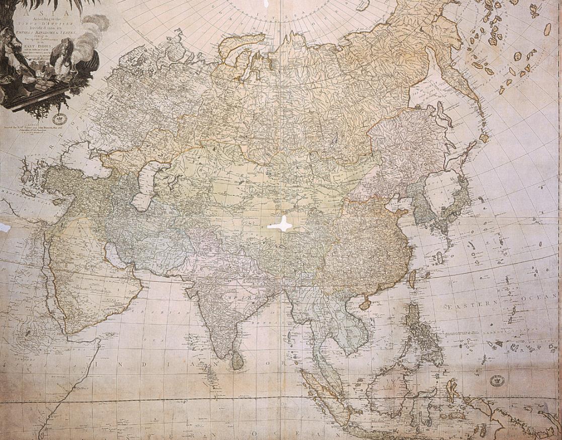 1767至1777年期间,詹姆斯•伦内尔担任了孟加拉第一任测绘局长,由于其他在这里展开的开拓性地图绘制工作,被人们认作印度的地理之父。在当时的孟加拉总督罗伯特•克莱夫的“迅速开始绘刹一幅孟加拉全图”命令下,詹姆斯•伦内尔从1766年开始了勘测恒河及周围地区的工作,在经过了不少于500次的单独测量后,他编辑出版了孟加拉地图。1779年他出版自己编辑的地图集,其中收入了这幅亚洲全图(图7.14),这幅地图是当时最为全面也最为精确的亚洲全图。