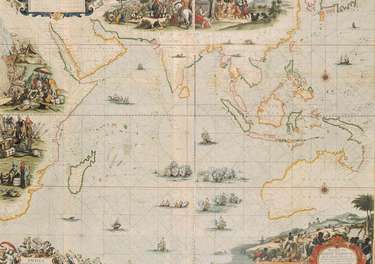 这幅纵71厘米,横90厘米的大幅海图,由17世纪后半期阿姆斯特丹最重要的海上资料出版商之一亨德里克·登克(Hendrick Doncker)出版,他的“名牌产品”,是海洋地图系列。同时,登克还出版了一系列挂墙地图。这幅印度洋、东印度海图就是专为室内装饰用的挂墙地图。这种地图因其精致的装饰,制作成本十分昂贵,图面上的许多装饰元素突出了所绘地区的财富,也可以说,此时这一地区的财富已经完全被西方殖民者所掌控。