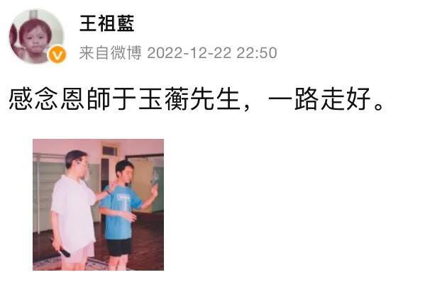 12月22日,著名戏曲教育家于玉蘅去世,享年98岁,王祖蓝发文悼念。
