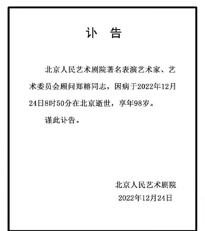 12月24日,知名表演艺术家郑榕去世,享年98岁。