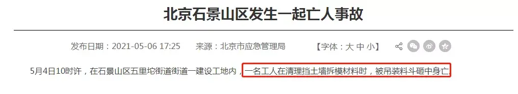 5月4日10时许,北京市石景山区五里坨街道一建设工地内,一名工人在清理挡土墙拆模材料时,被吊装料斗砸中身亡。