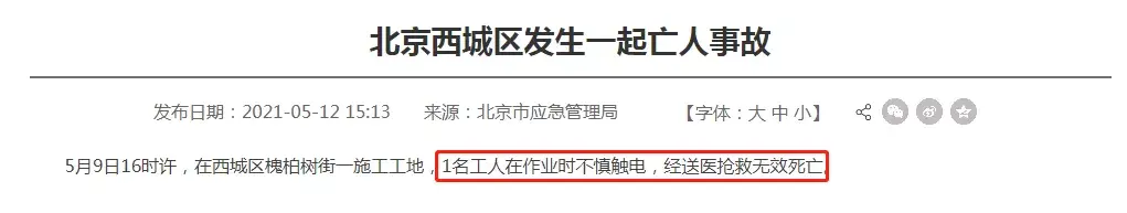 5月9日16时许,北京市西城区槐柏树街一施工工地,1名工人在作业时不慎触电,经送医抢救无效死亡。