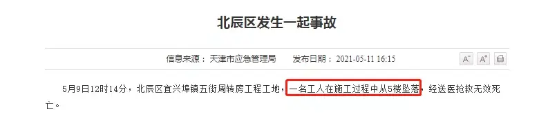 5月9日12时14分,天津市北辰区宜兴埠镇五街周转房工程工地,一名工人在施工过程中从5楼坠落,经送医抢救无效死亡。