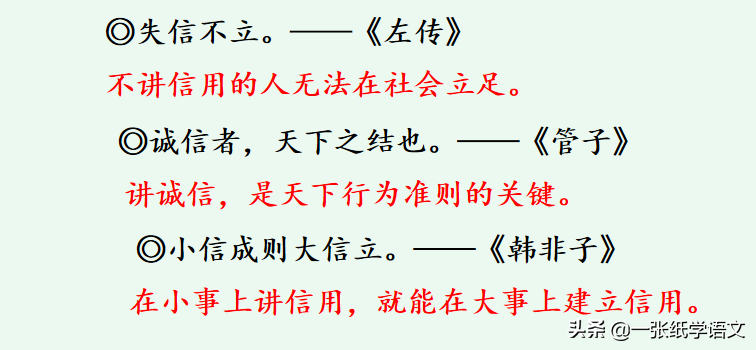 题目有印象,但是不确定写的答案是不是对的,需要计入错题本,这样的知识并没有掌握牢固。如“失信不立。”这句话出自《韩非子》对吗?答案:×,出自《左传》,可以翻看语文书语文园地四的p55日积月累,重新记一遍三个名言出处(本学期就3个),甚至可以用上一点小方法,简记关联词:失左,诚管,韩信(小韩),这种谐音记忆有利有弊,句意掌握的情况是可以使用的,否则填空题就很容易写错字。