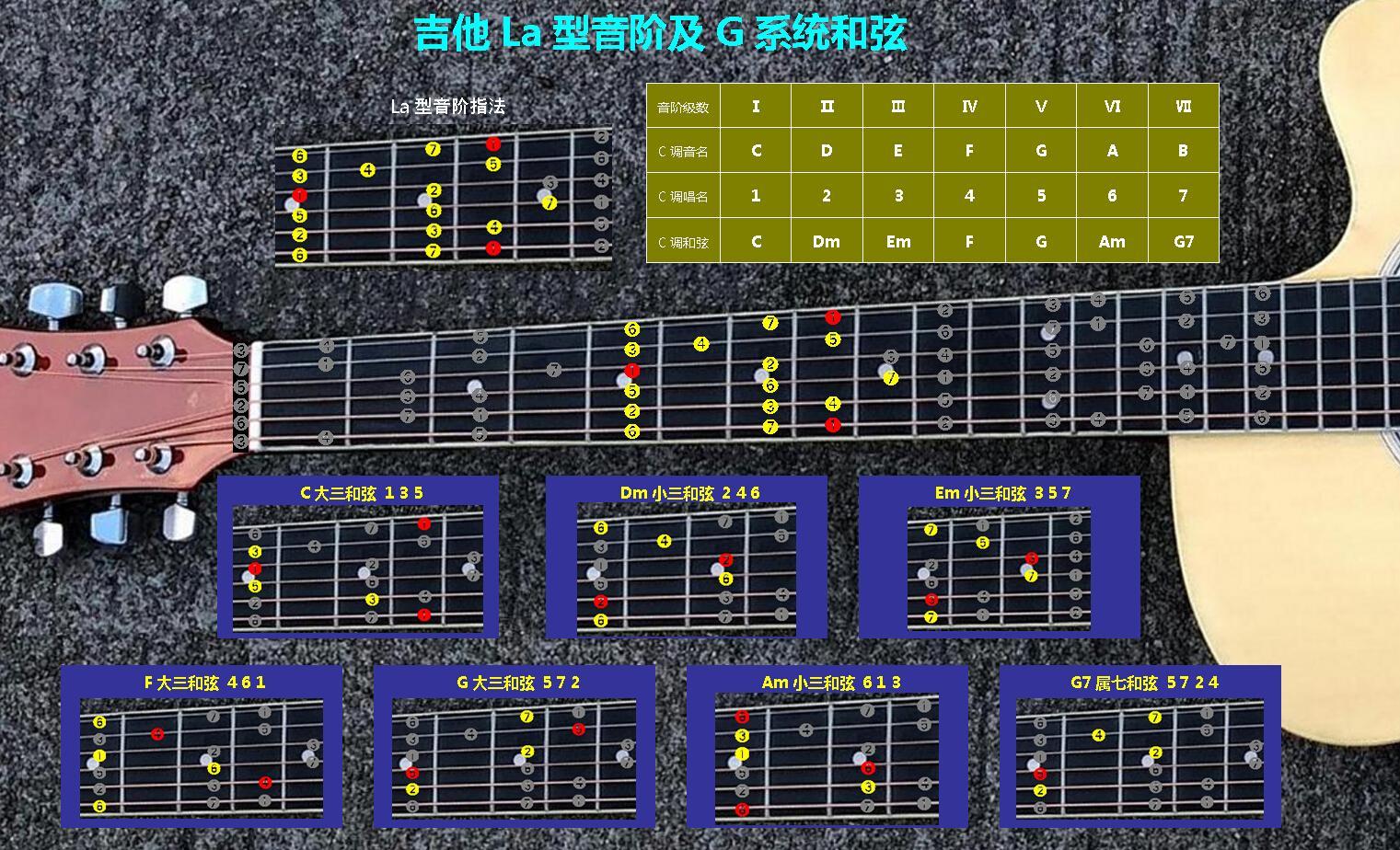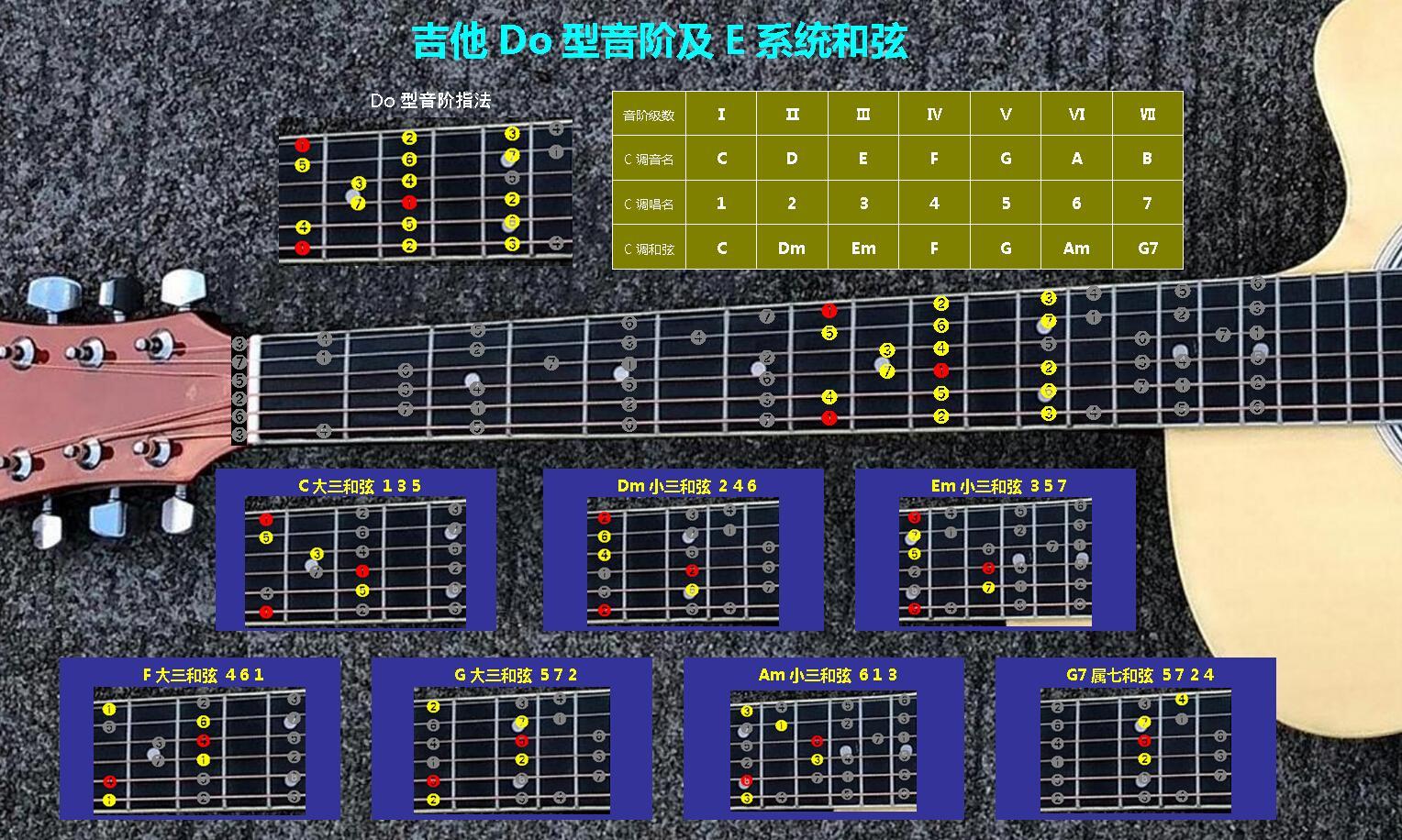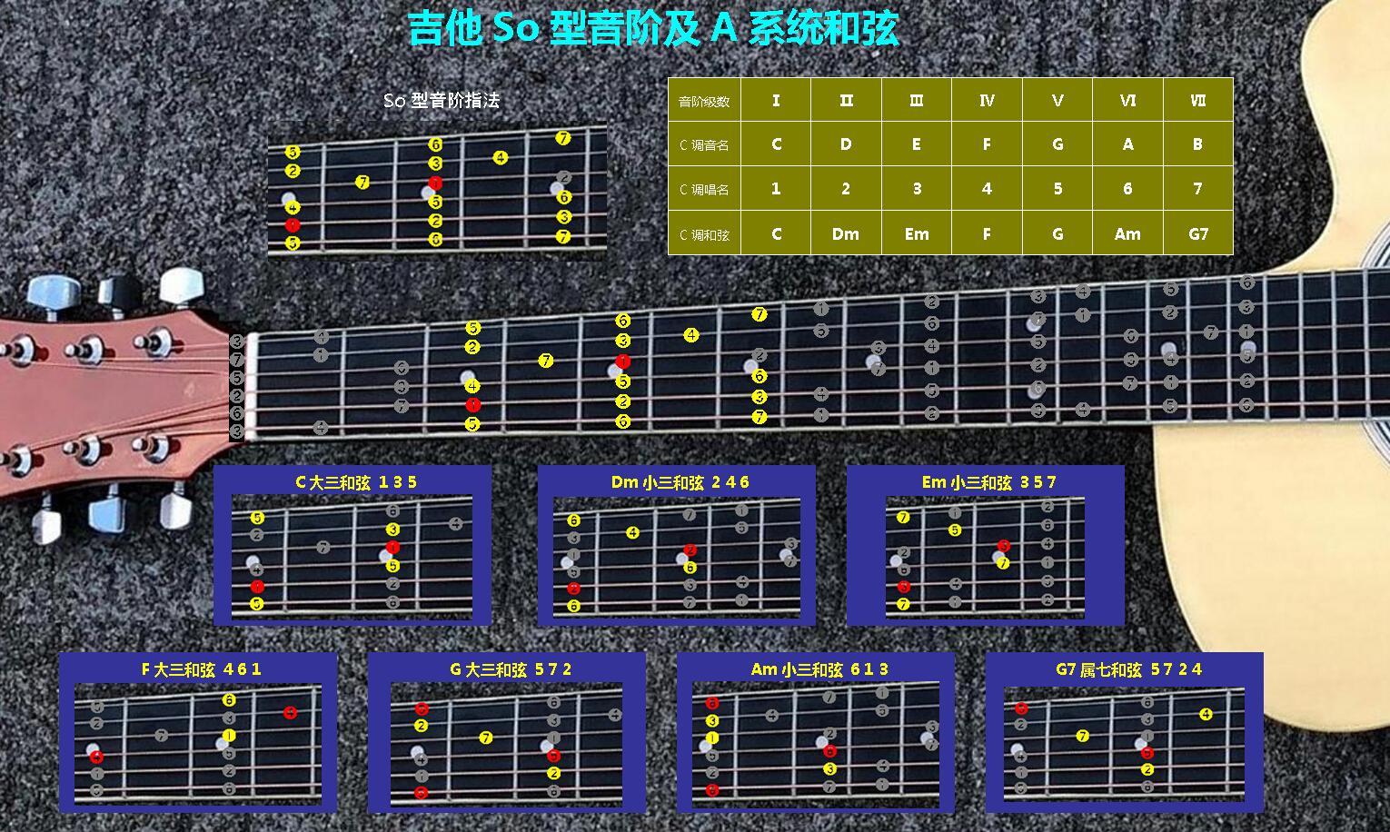 吉他Mi-So-La-Do-Re五种音阶指法及C-A-G-E-D五个系统和弦