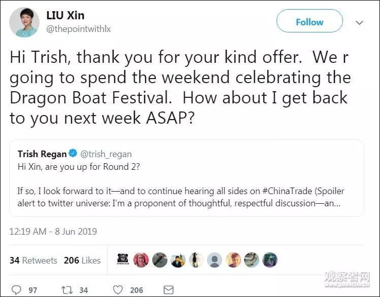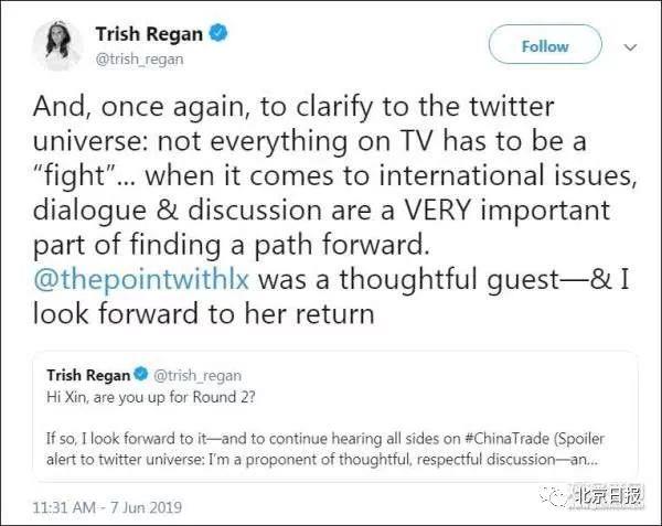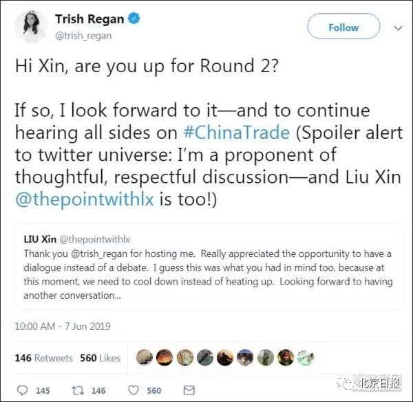 北京时间今日凌晨0时20分许,中国CGTN女主播刘欣正式回复了美国FOX商业频道女主播翠西·里根关于再次对话的邀约。