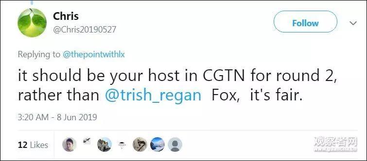 值得一提的是,对于二轮究竟是“辩论还是对话”的话题,翠西昨日也在推文中表示:“我再向推特社区强调一次,电视上不是所有的东西都应该是‘斗争性质的(fight)’……涉及国际话题,对话和讨论是我们寻求前进非常重要的途径。”并再次夸赞刘欣是一个有内涵的嘉宾。