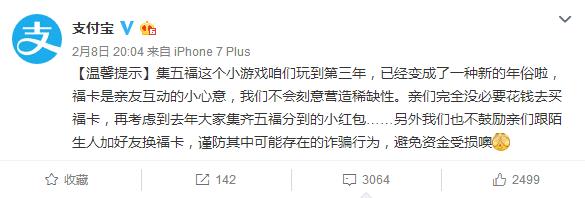 亲们完全没必要花钱去买福卡,再考虑到去年大家集齐五福分到的小红包……另外我们也不鼓励亲们跟陌生人加好友换福卡,谨防其中可能存在的诈骗行为,避免资金受损噢