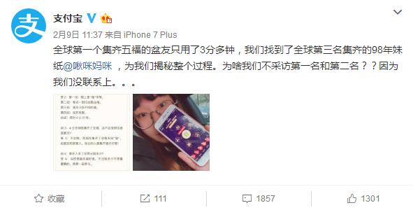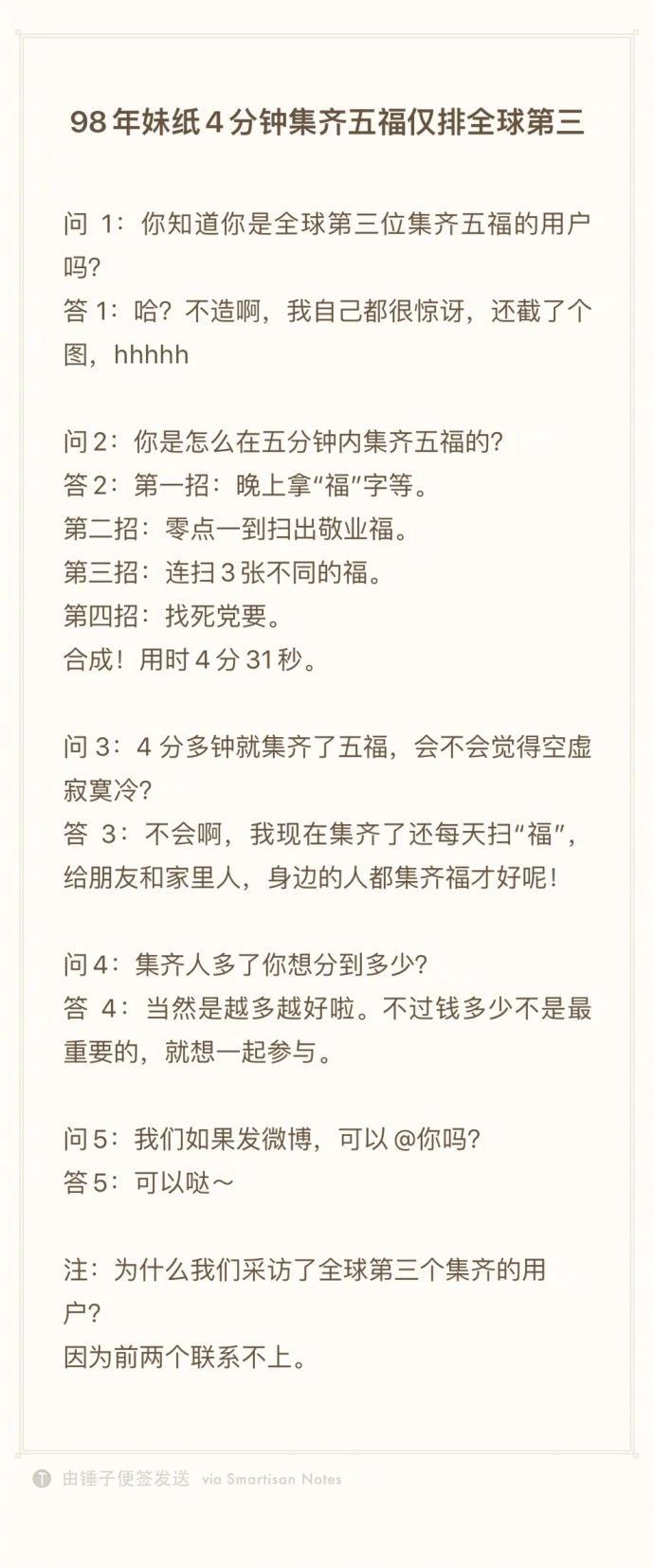 那么是如何做到三分钟集齐五福的呢,看看集齐的这位 朋友是怎么回答的: