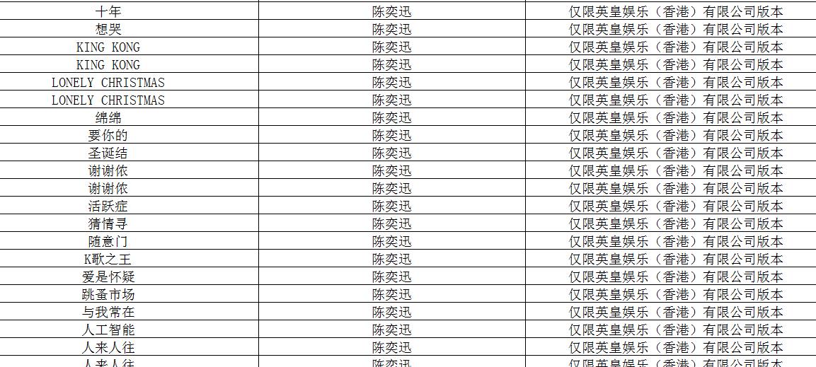 公告中附有下架歌单,陈奕迅、邓紫棋、Twins、容祖儿等粤语歌曲下架数量众多,包括了《泡沫》《你把我灌醉》《下一站天后》《十年》《K歌之王》等多首英皇版本的粤语歌,也包括了部分中国新歌声、中国好歌曲、蒙面唱将版本的作品。