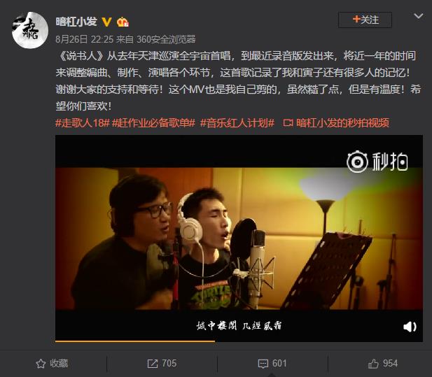说起暗杠小发,喜欢民谣的宝宝们可是无人不识,一把小清新的吉他加上清澈温柔的嗓音征服了无数观众。其实他还有一个身份,就是斗鱼音乐区的主播,也正是因为此,暗杠与斗鱼很多主播私交都非常好,也有很多深受网友们喜欢的合作作品。单曲《说书人》就是与斗鱼主机区主播寅子合唱的,暗杠昨日在微博发布了自己剪辑的MV,用镜头记录了自己和寅子一年来唱歌的回忆。