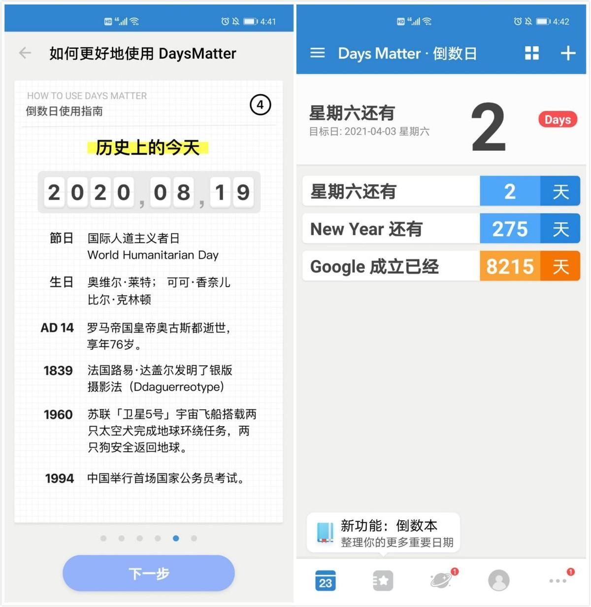 不同于一般的倒数日app,这个除了比其他的简单、明了之外,还有提醒和日历同步的功能,最值得一提的还是历史上的今天、明天功能,让你认识历史和人物,小巧却很实用。