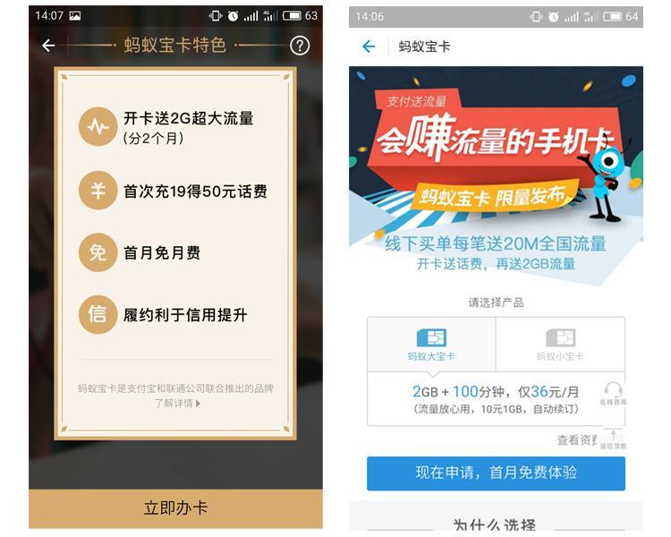 可以看到,蚂蚁宝卡有四大特色:一是开卡即送2GB流量,二是首冲19元可得50元话费,三是首月免月费,四是还可以提升信用,应该是和芝麻分有一定联系吧。这四大特色不知你是否喜欢?