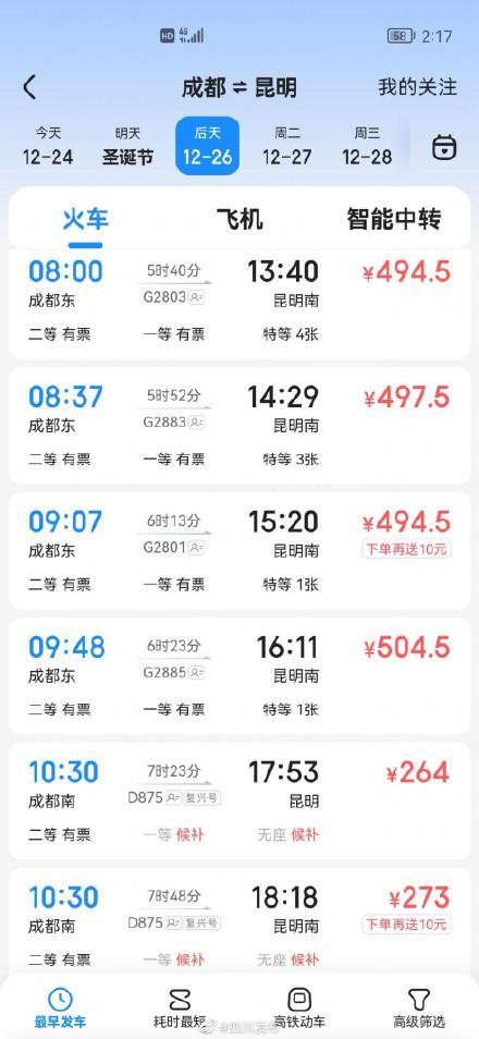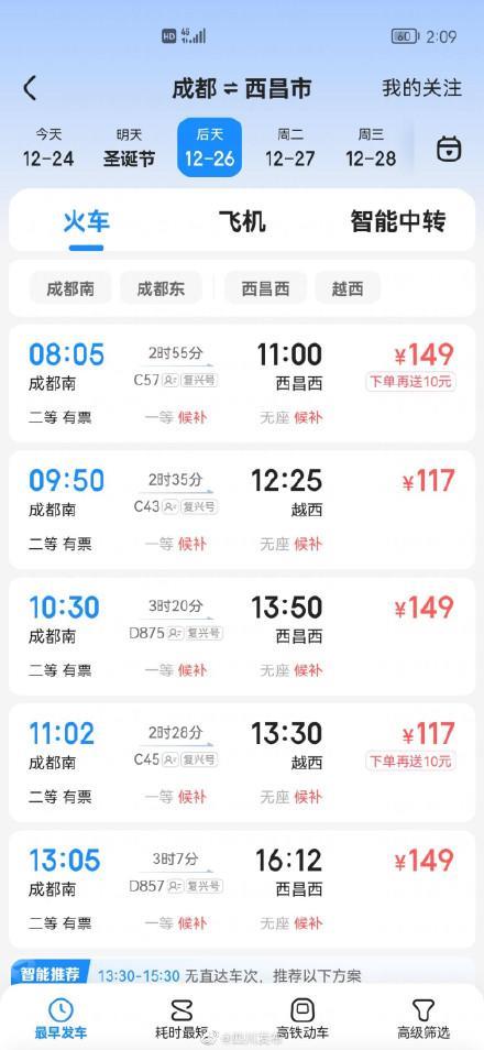 新成昆铁路车票开始发售!成都到西昌二等座票价149元、到攀枝花191元