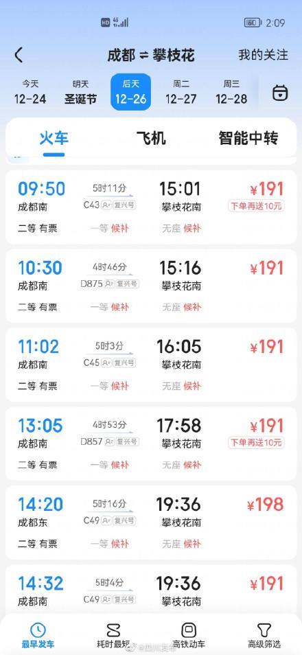 成都南站到攀枝花南站最快用时4小时46分钟,最长用时为5小时16分钟,二等座票价为191元。
