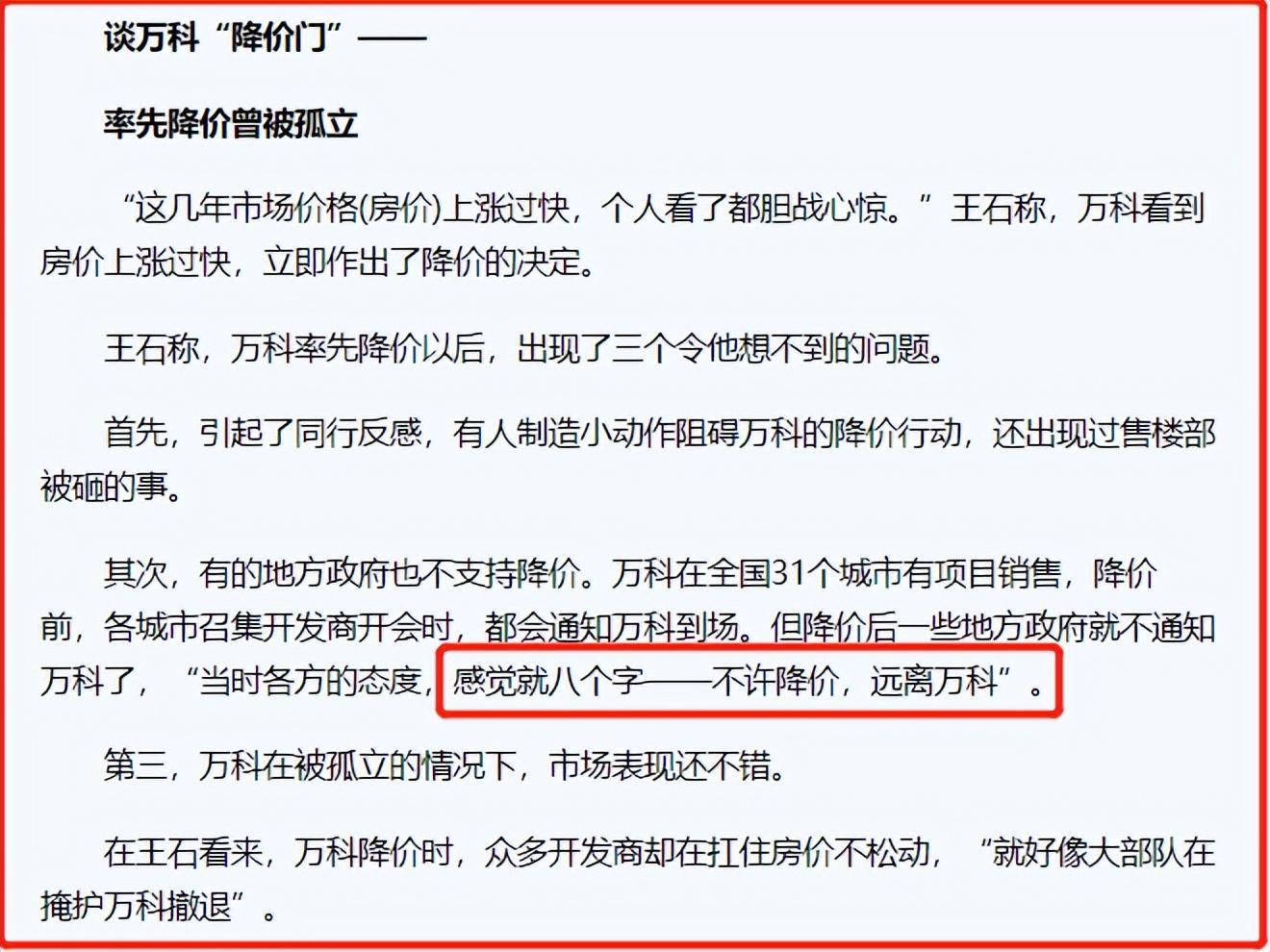 王石却看得很开,万科降价时,众多开发商扛住房价不松动,“就好像大部队在掩护万科撤退”。